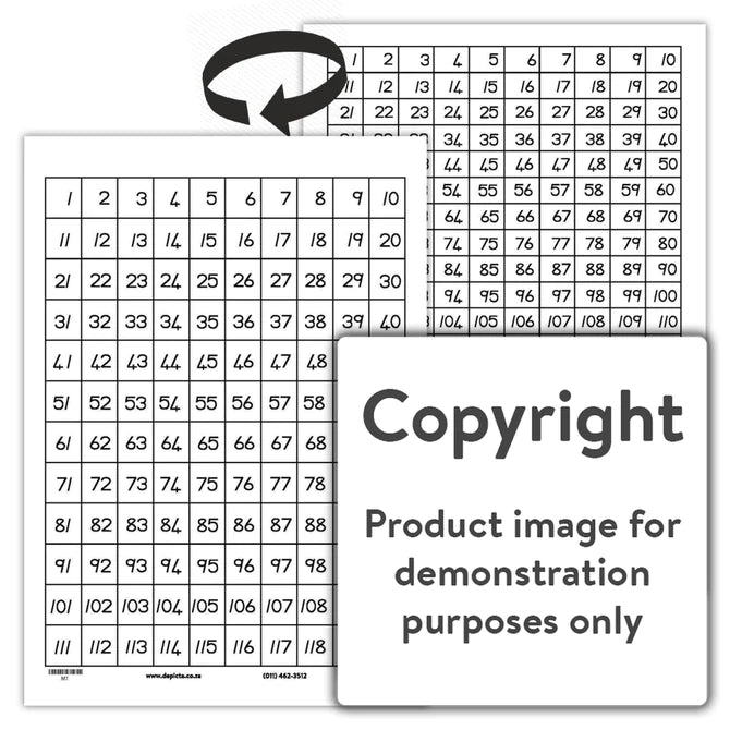 Numbers 1 - 120 in blocks laid out as a grid on one side. Numbers 1 - 200 in blocks laid out as a grid on the other side.