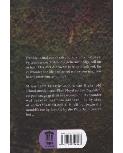 Frankie se gesin is anders. Haar pa kom van Vlaandere, lyk soos Atilla die Hun, en hy praat nog steeds Nederlands - en soms 'n bietjie Frans as hy Frankie wil treiter. Hy ry met 'n Big Boy-bromponie en het sy eie kookskool. Haar ma het in die hippie-jare vasgesteek, dra batik-broeke en het die hele planeet en al sy bewoners lief. En Frankie? Sy is mal oor skaatsplank ry en kunsflieks. Sy wonder oor Milan, die geheimsinnige, stil ou in haar klas met die swart hare en bleek vel. En sy wonder oor die papier-rot en die Banksy-boek wat sy een oggend op haar balkon kry.