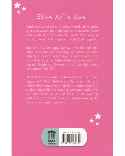 Elmien droom daarvan om eendag ná skool ’n dokter te word. Maar waar sy vandaan kom, is dit ’n gróót droom. Hoewe 717 is die amptelike naam van die plakkerskamp waar sy die aantreklike Ruan ontmoet en uit die nare oom Bok se vatterige kloue moet probeer bly. ’n Onvergeetlike Aspoester-verhaal wat wys dat drome kan waar word …