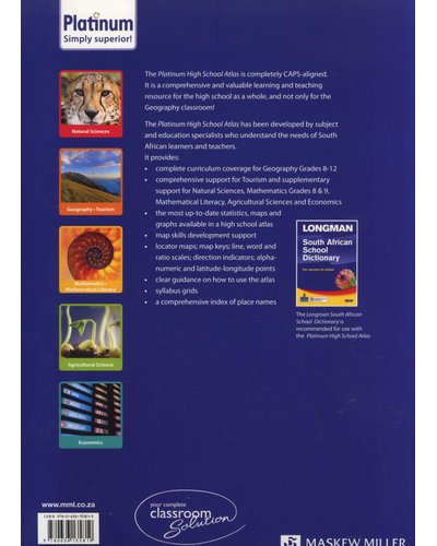 The most up-to-date maps and graphs available in a high school atlas; The latest statistical information; Locator maps; map keys; line, word and ratio scales; direction indicators; and alpha-numeric and latitude-longitude grids; Clear guidance on how to use the atlas map skills development support; syllabus grids; complete curriculum coverage for Geography Grades 8 -12, with support for other subjects such as Natural Sciences, Mathematics, Agricultural Sciences, Economics and Tourism.