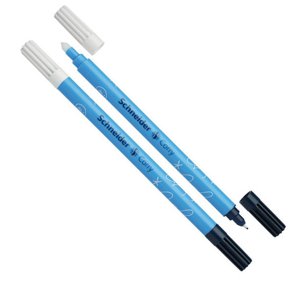 Schneider Corry ink eradicator pen for Schneider Blue ink. Double tip - white tip erases washable blue ink, blue tip allows for perfect overwriting. The broad white point makes it easy to erase whole words. Assorted barrel colours - all for blue ink. Made in Germany.